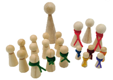 Die Holzkegelfiguren lassen sich durch farbige Pfeifenputzer (Chenille-Draht) sehr einfach und wirksam kenntlich und unterscheidbar machen