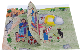 Die Frauen blicken auf. Und da sehen sie: Der Stein, der das Grab verschlossen hat, ist weggerollt. Das Grab ist offen. Also gehen sie hinein.