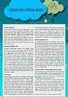 Für die Geschichten in der Geschichten-Box orientiert sich das Kiki-Team Tailfingen an den Erzählvorschläge aus dem Heft »Evangelische Kinderkirche – Praxisentwürfe für Kirche mit Kindern und Familien«, die wiederum am Plan für den Kindergottesdienst ausgerichtet sind.