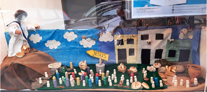 Schaut man durchs Fenster links vom Eingang, ist die Szene einer biblischen Geschichte zu entdecken: Jona mitsamt dem (Wal-)Fisch, Josef mit seinen Brüdern, Gideon, Elia, Rut und Daniel. Auch viele Geschichten mit Jesus aus dem Neuen Testament und solche, die Jesus erzählt hat – wie z. B. die vom barmherzigen Samariter. Ab und an gibt es auch Geschichten in der Box zu sehen, die vom Kirchenjahr bestimmt sind: eine aktuelle Erntedank-Geschichte oder im November etwas zum Thema Tod und ewiges Leben.